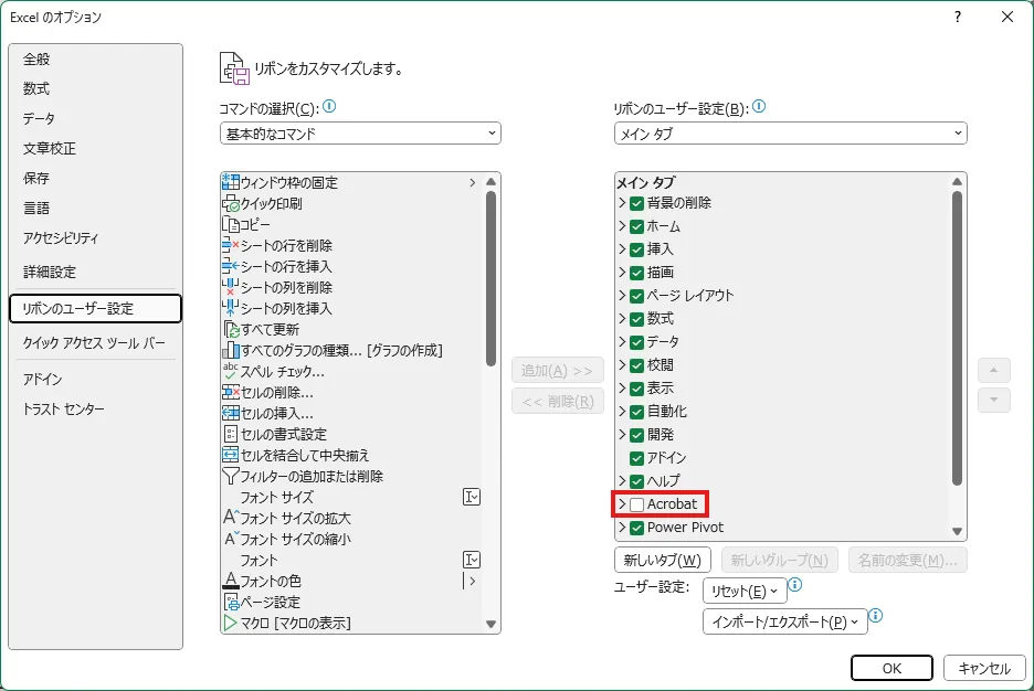 「リボンのユーザー設定」の「Acrobat」のチェックを外す
