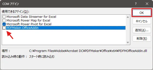 「PDFMaker.OfficeAddin」のチェックを外し「OK」をクリック