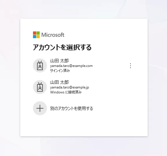 Windows PCのサインインに使っているアカウント(Windows接続済みアカウント)と、Edgeでサインインしているアカウント(サインイン済みアカウント)が異なっているため、選択画面が表示される。