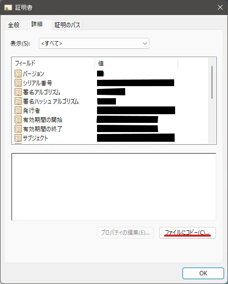 証明書にエクスポートウィザードを進めて、証明書をファイルにエクスポートする。 エクスポートした証明書は、docker cpコマンドでコンテナにコピーする。