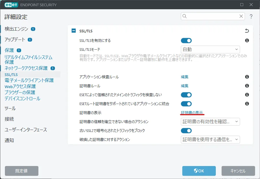 ESETの詳細設定画面を開き、下図の赤線部分(証明書の表示)をクリックする。