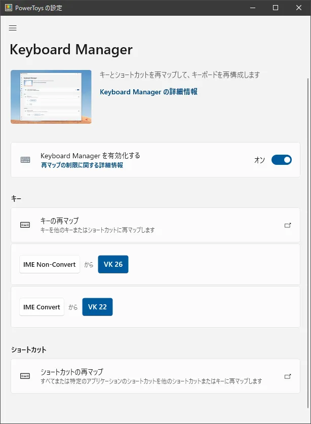 ここに記載するのはPowerToysのみを使う方法。最近のWindowsでは「A」「あ」というIMEの無効化・有効化を切り替えできる仮想キーが追加されたので、KeyBoard Managerを使って下図のようにマッピングする。この方法のメリットは、KeyBoard Managerを無効化するとすぐに元に戻せること。
