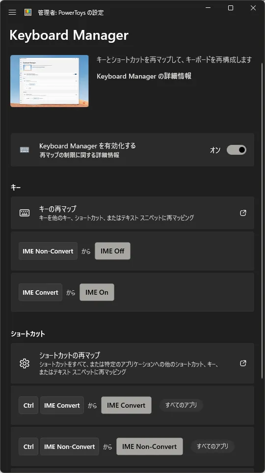 ちなみに、IME Non-Convert は「無変換」キー、IME Convert は「変換」キーを示している。また、IME OffがIMEの無効化、IME OnがIMEの有効化に対応する。
