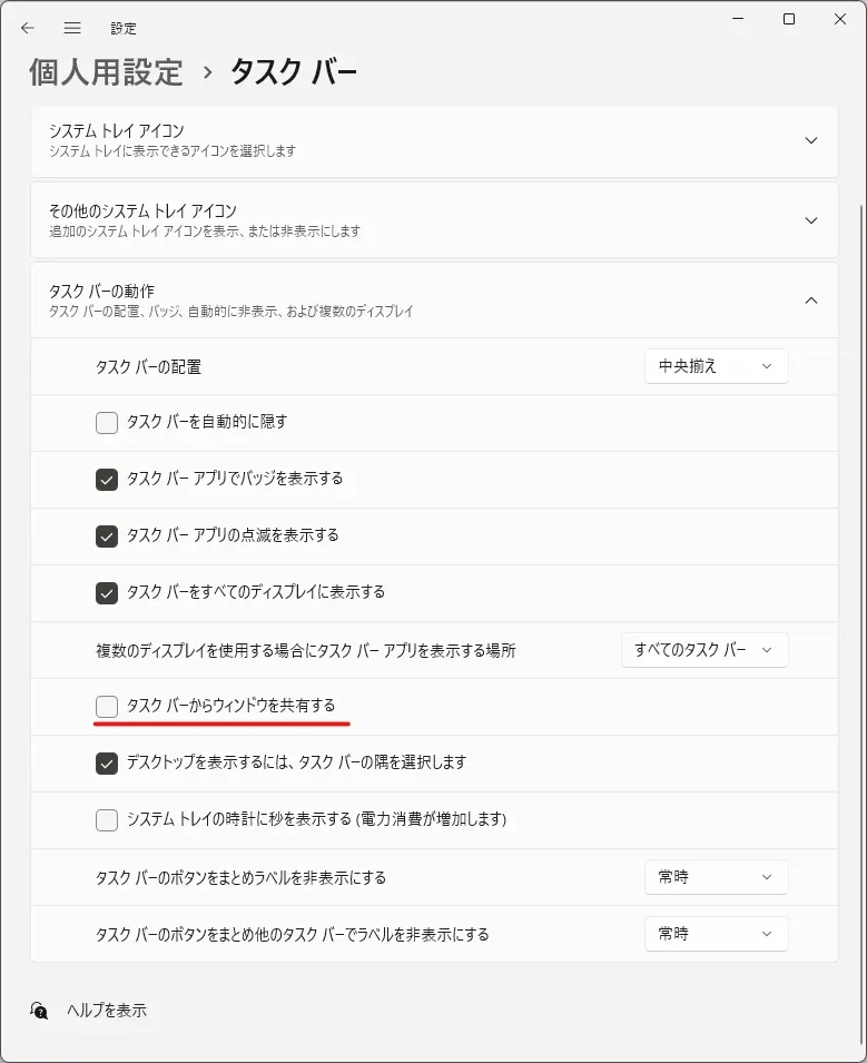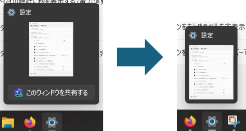 Teams使っていると出てくる「このウィンドウを共有する」(Share this window)を非表示にするには、設定アプリの「個人用設定」→「タスクバー」→「タスクバーの動作」における「タスクバーからウィンドウを共有する」のチェックを外す。